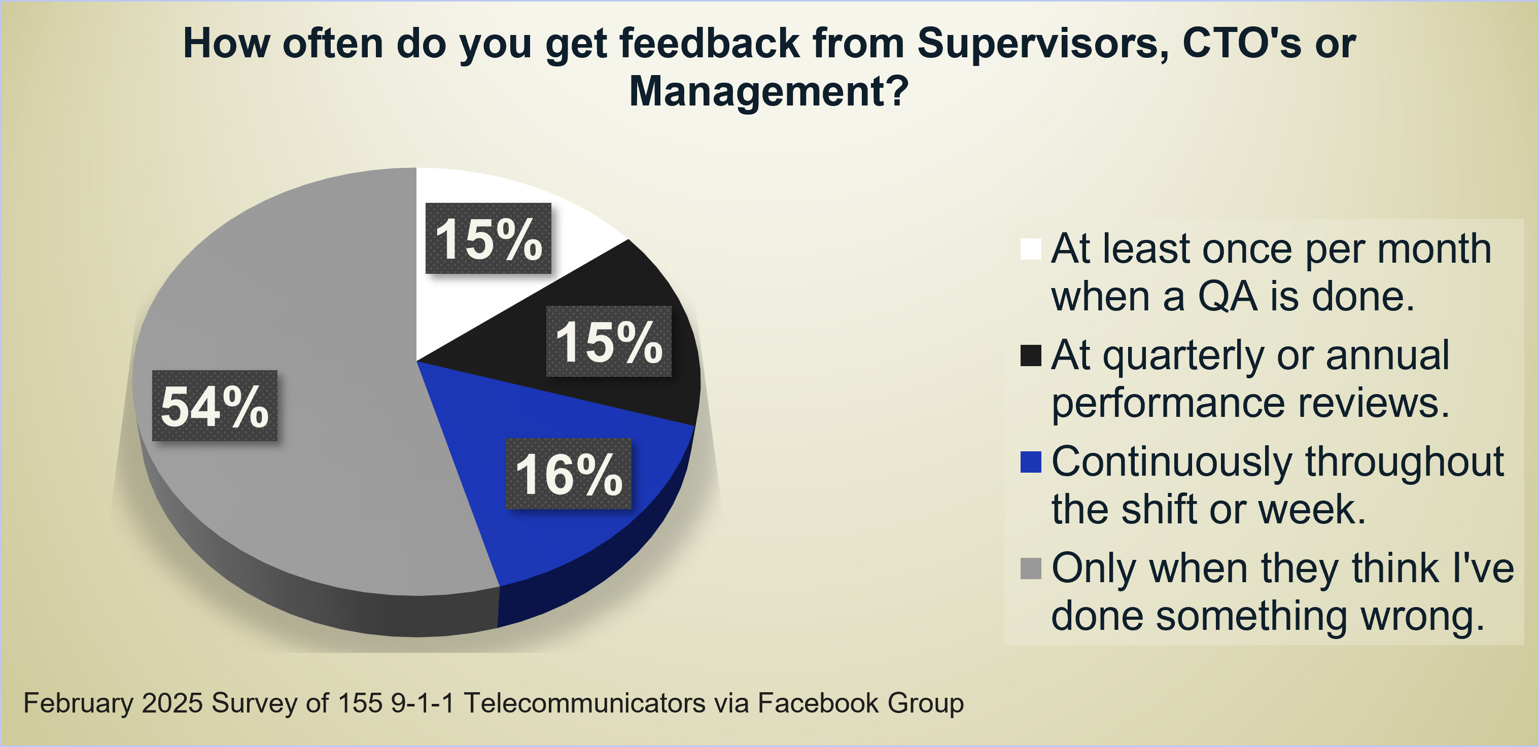 In a February 2025 survey of 155 9-1-1 telecommunicators, over half (54%) said they receive feedback only when they’ve done something wrong; a negativity bias. Just 16% reported receiving ongoing feedback throughout their shifts, and only 15% get feedback tied to regular QA reviews. These findings highlight a major opportunity for ECCs to rethink how and when they provide performance insights.
