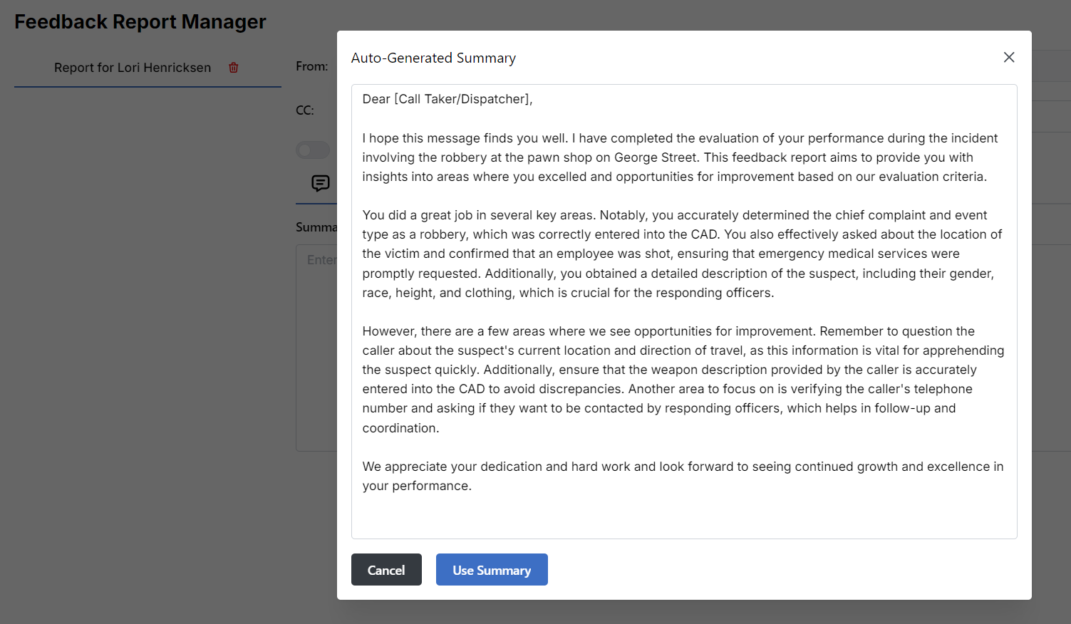 Many of today's ECC supervisors are new to the role and have neither the experience or training yet on how to provide coaching and feedback to their teams. One of the challenges in providing feedback is finding the right balance between recognizing accomplishments and pointing out areas for improvement. Telecommunicators, like any professional, need to feel appreciated for their hard work and the critical role they play. CommsCoach makes this easier by generating feedback suggestions based on the detailed evaluations, offering a balanced approach that highlights both strengths and areas where coaching could be beneficial. The new Feedback Report Manager generates personalized summaries. These summaries not only recognize strengths but also identify areas where an individual can refine their skills—an approach designed to foster confidence and continuous growth without focusing on shortcomings.